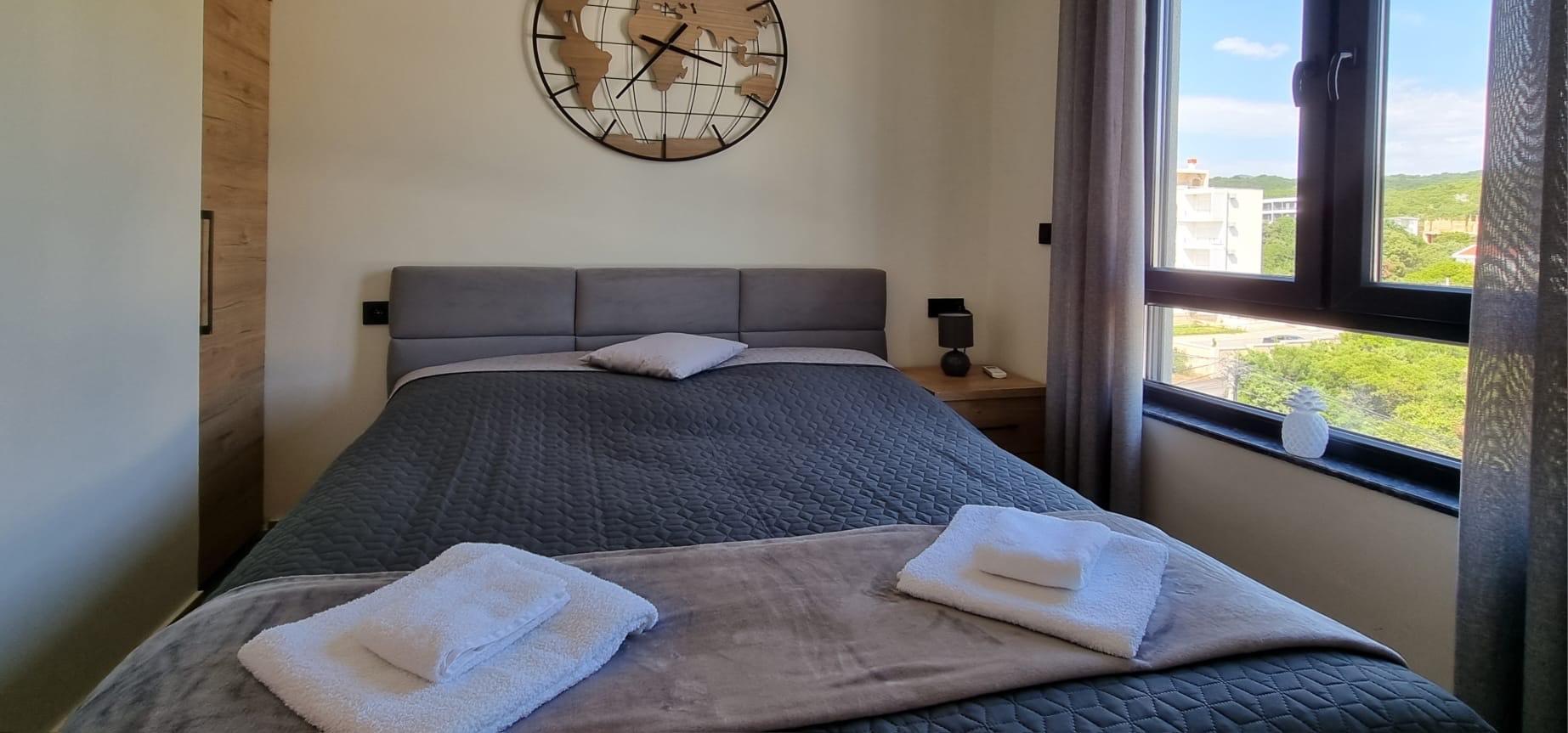 Piękny i słoneczny apartament z widokiem na morze. Kuchnia w pełni wyposażona. W salonie sofa rozkładana do wygodnego łóżka dla dwóch osób. W sypialni łóżko podwójne